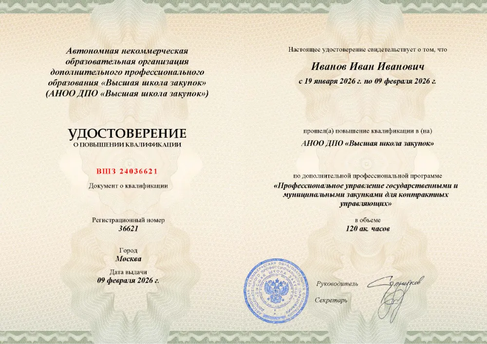 Вы получаете официальное удостоверение о повышении квалификации. Высшая школа закупок (fz44.org) обеспечивает передачу данных в реестр ФИС ФРДО, подтверждая соответствие вашей подготовки в Калининграде требованиям Минтруда.